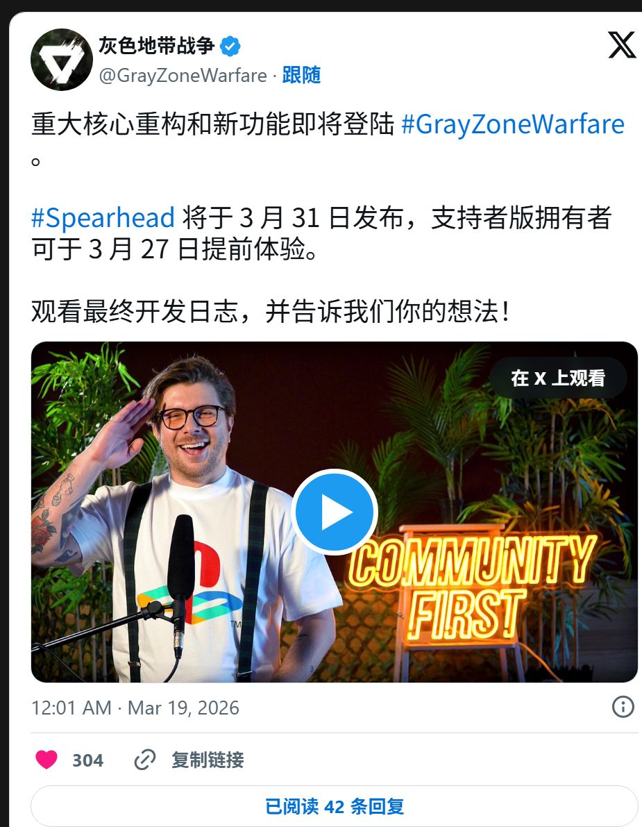 MADFINGER Games 今日正式揭晓,《灰区战争》(Gray Zone Warfare)万众期待的 0.4 版本“矛头(Spearhead)”将于 3 月 31 日全球同步上线,Support Edition 玩家可于 27 日抢先入场。