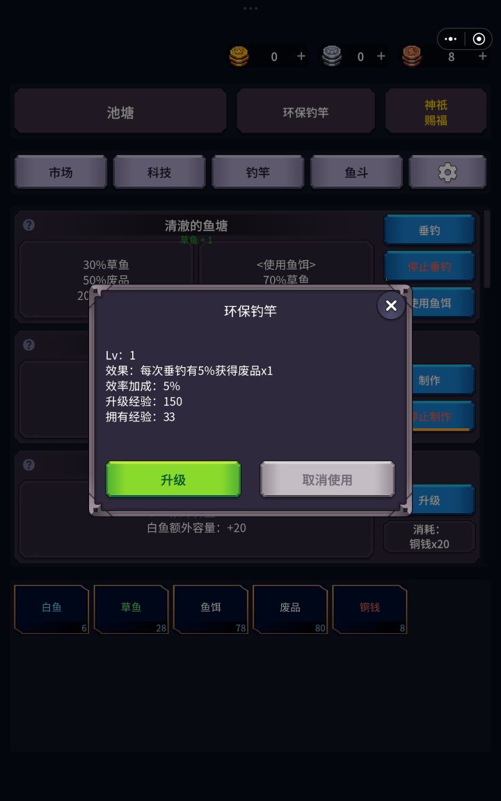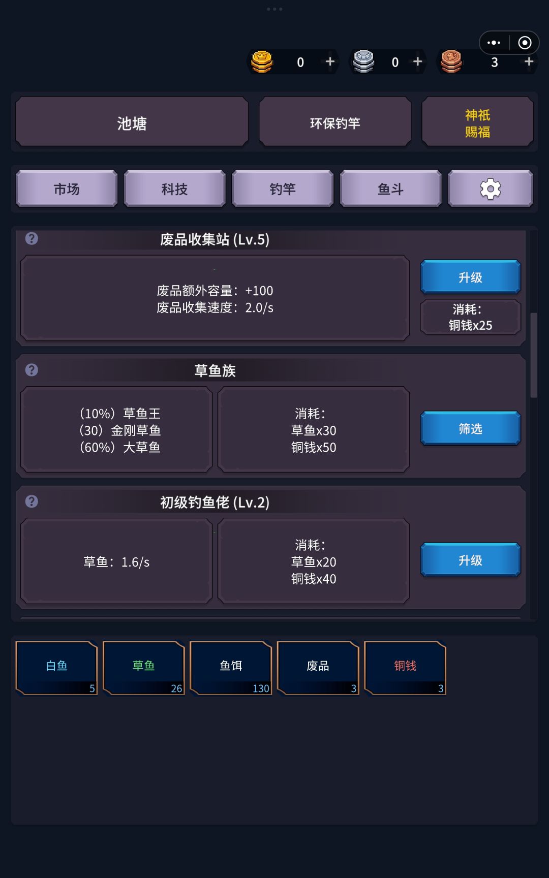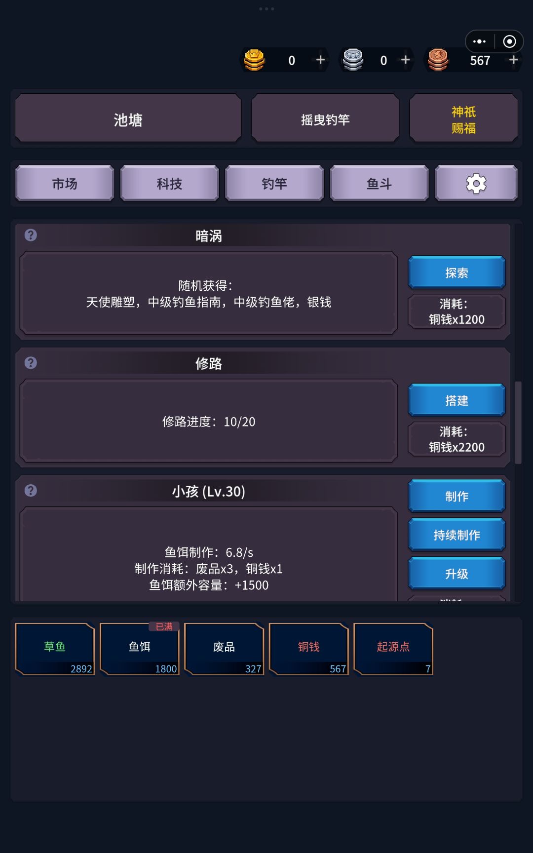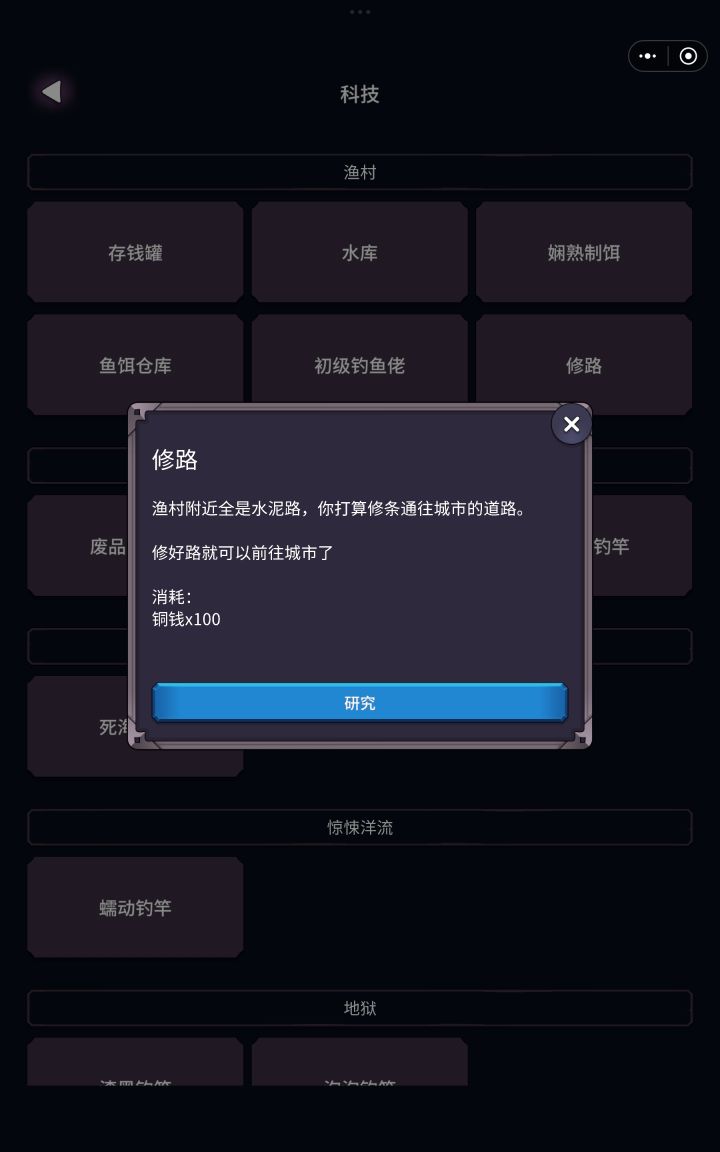 没有任何任务引导,但是上手挺快的——空手钓鱼,然后去市场换铜钱,再用铜钱提升自己的科技(推荐第一时间研究钓竿,毕竟钓竿经验本身就是需要通过钓鱼来累积)。循环往复扫荡清澈的鱼塘,等你累积铜钱一次又一次修好路(注意此处暗坑:每次修路费用递增且不会重置,第一次虽然仅有100铜钱但仅第十次就已高达2000铜钱)就可以离开农村前往城市啦!看似简单其实潜力无限的作品,我很喜欢!