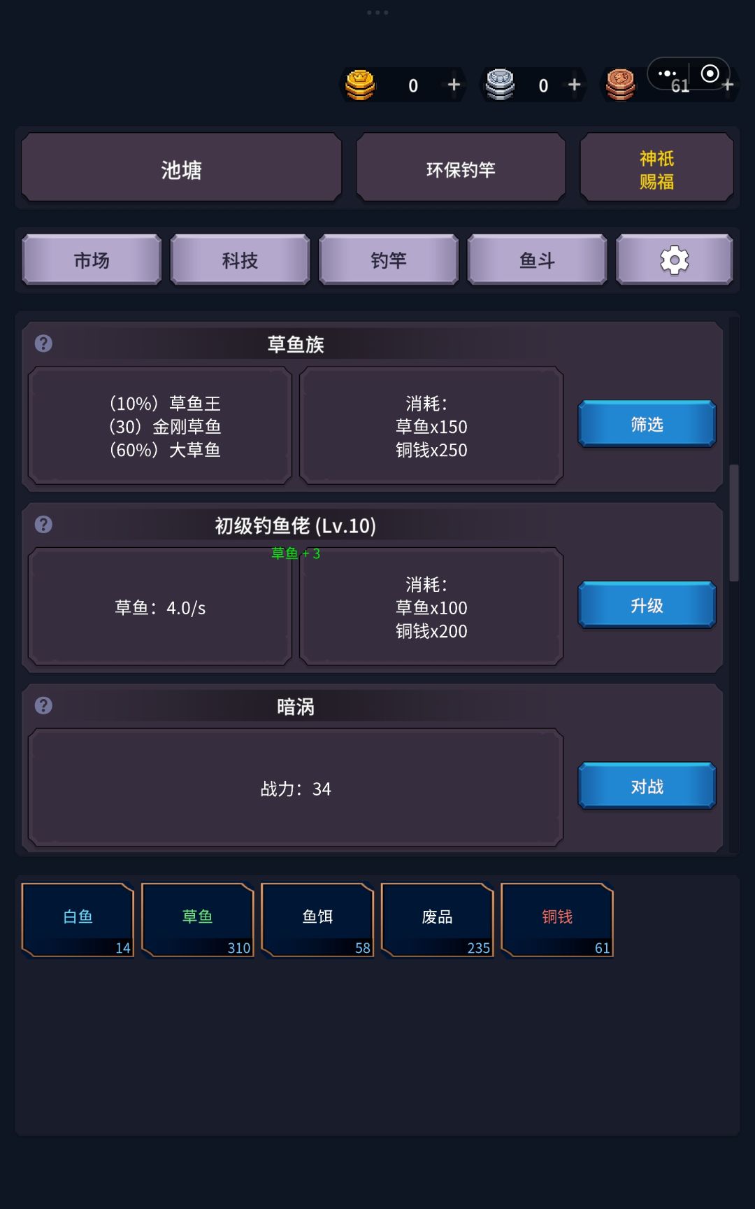 二、你每从草鱼族筛选一次草鱼,下一次的筛选费用就会增加(但是进度每天会重置,所以切记不要上头)。而且强烈建议你不要在鱼斗界面随意遗弃那些战斗力不高的鱼——因为鱼斗是按照数值比大小,而且每次战斗结束你的队伍会消失(鱼斗之后全员死亡,这倒是挺拟真的)。如图五所示,暗涡目前战斗力只有34(初始是50)就是因为我派了两只金刚草鱼去冲了一次(一只战力8一只战力6,而且草鱼族加成1.2,14*1.2=16.8结果还不给我四舍五入——就只按照16算)。