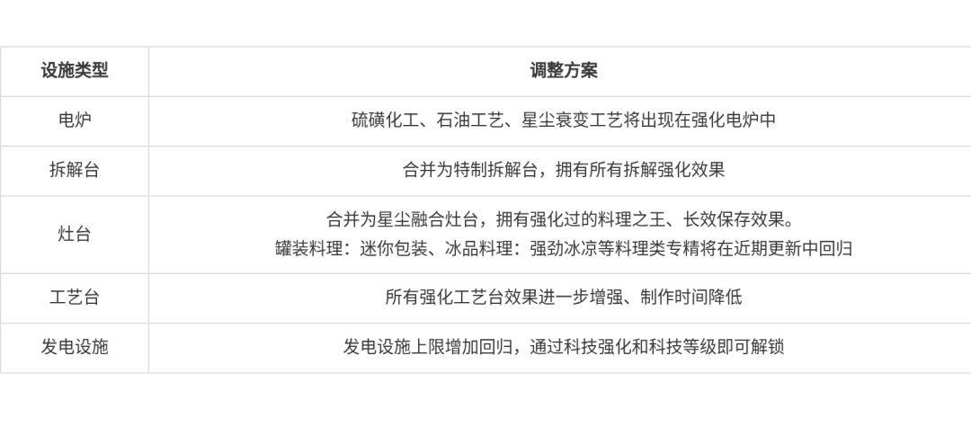 - 制造设施相关专精效果已整合到全新的强化设施中,可通过大世界探索/科技解锁获取