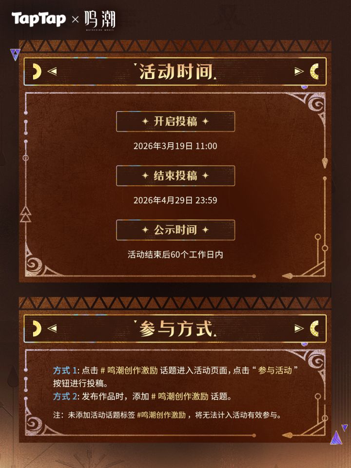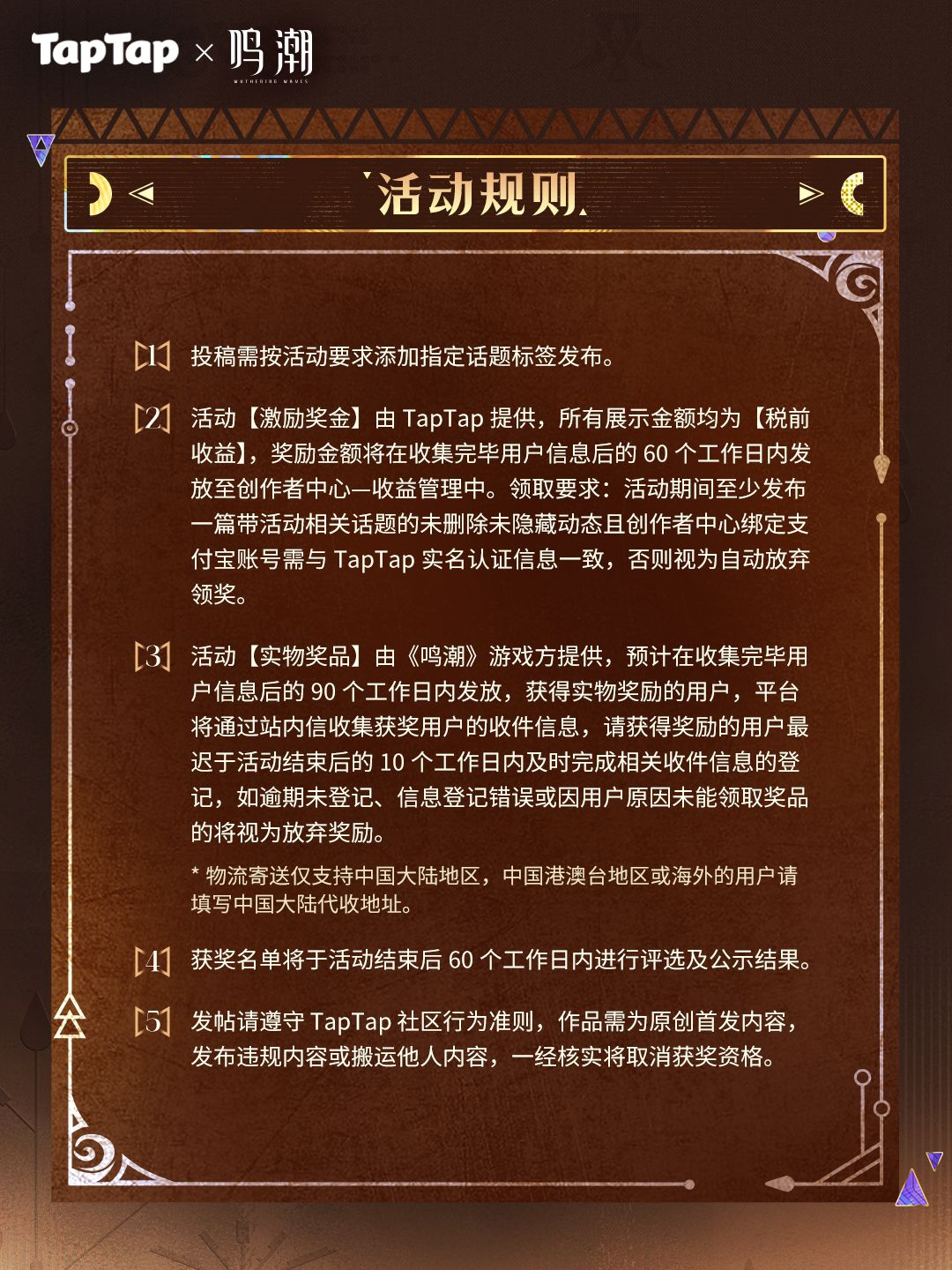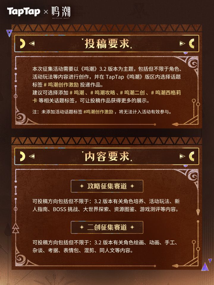本次征集活动需要以《鸣潮》3.2版本为主题,包括但不限于角色、活动玩法等内容进行创作,并在TapTap《鸣潮》版区内选择话题标签 #鸣潮创作激励