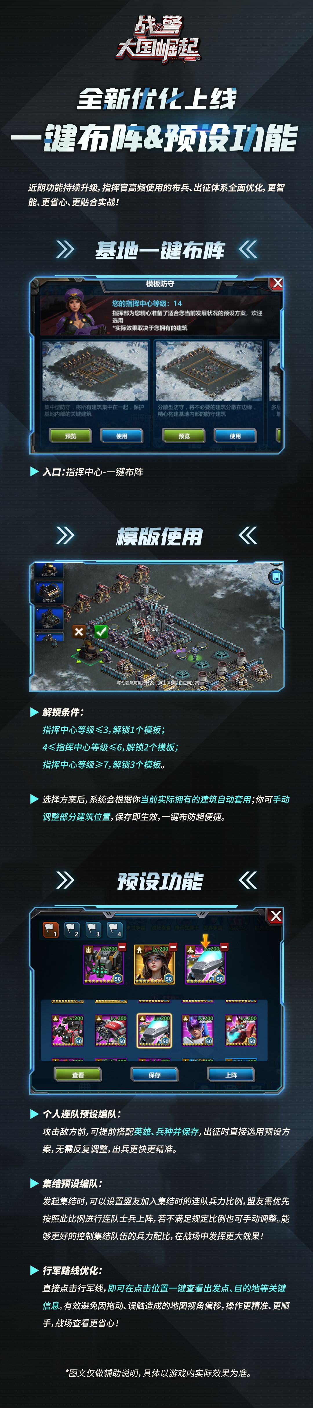 近期功能持续升级,指挥官高频使用的布阵、出征体系全面优化。详情请戳大图了解!