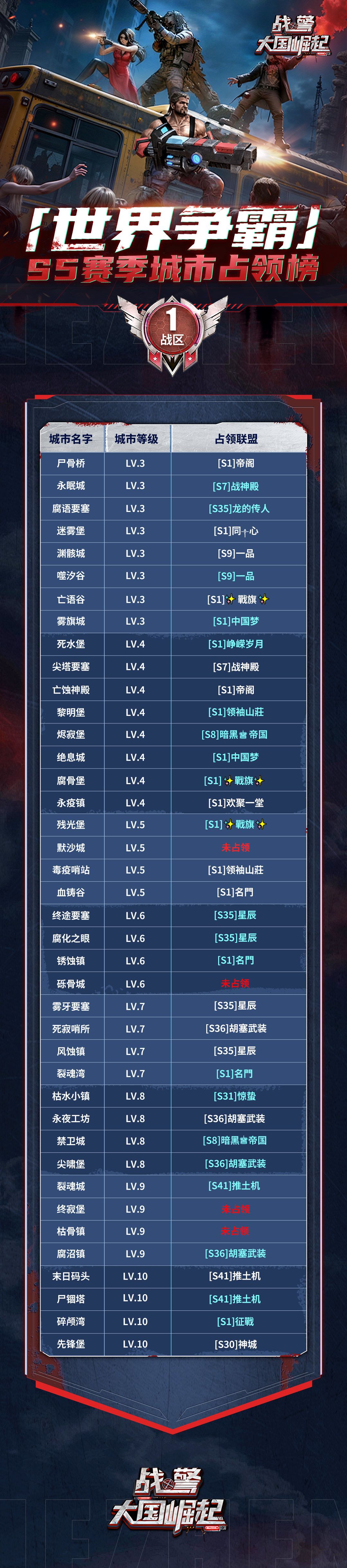 各联盟向着心仪城池全力冲锋,攻城掠地、扩张版图,用实力锁定战场优势!一起来看看你所在的战区,高阶城市都有谁占领?
