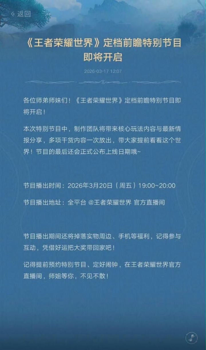 近日,《王者荣耀世界》官方宣布,定档前瞻特别节目将于3月20日19:00-20:00在全平台官方直播间播出,节目将披露核心玩法与最新情报,并正式揭晓游戏上线日期。