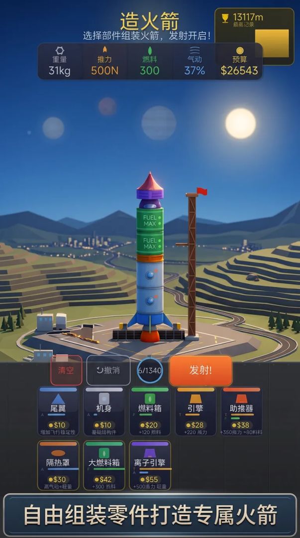 类坎巴拉的火箭制造模拟游戏,基本实现火箭的各个部位负责不同功能的设计,具备一定可玩性,放在当下在Tap制造游戏里算得新颖。Tap制造在本中罕见使用了2D图层叠加产生景深的方案,且有不错的实机表现效果。虽然场景潦草但已经有地平线运动的感觉,值得参考。
