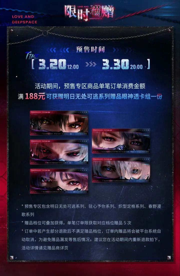 预售时间为3月20日12:00至3月30日20:00,玩家可前往天猫叠纸心意旗舰店选购。官方同步开启满赠福利,活动期间预售专区单笔订单满188元,即可获赠明日无处可逃系列眼神透卡组一份,档位可叠加,单笔订单最多可获赠5次。