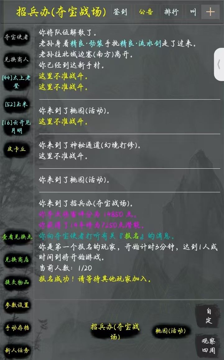 新手村广场西北方向的桃园(活动)往左,招兵办(夺宝战场),对话夺宝使者报名以后,等待三分钟即可进入。