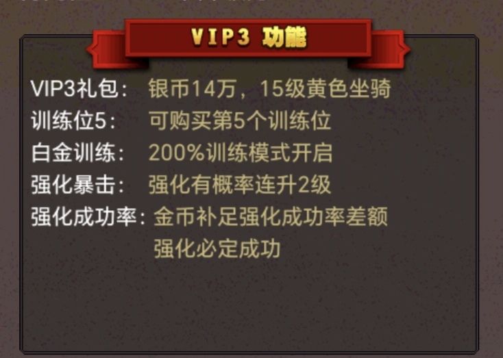 · 100%成功:VIP3还可使用金币提升成功率模式,让强化几率达到100%。(不建议,巨坑)