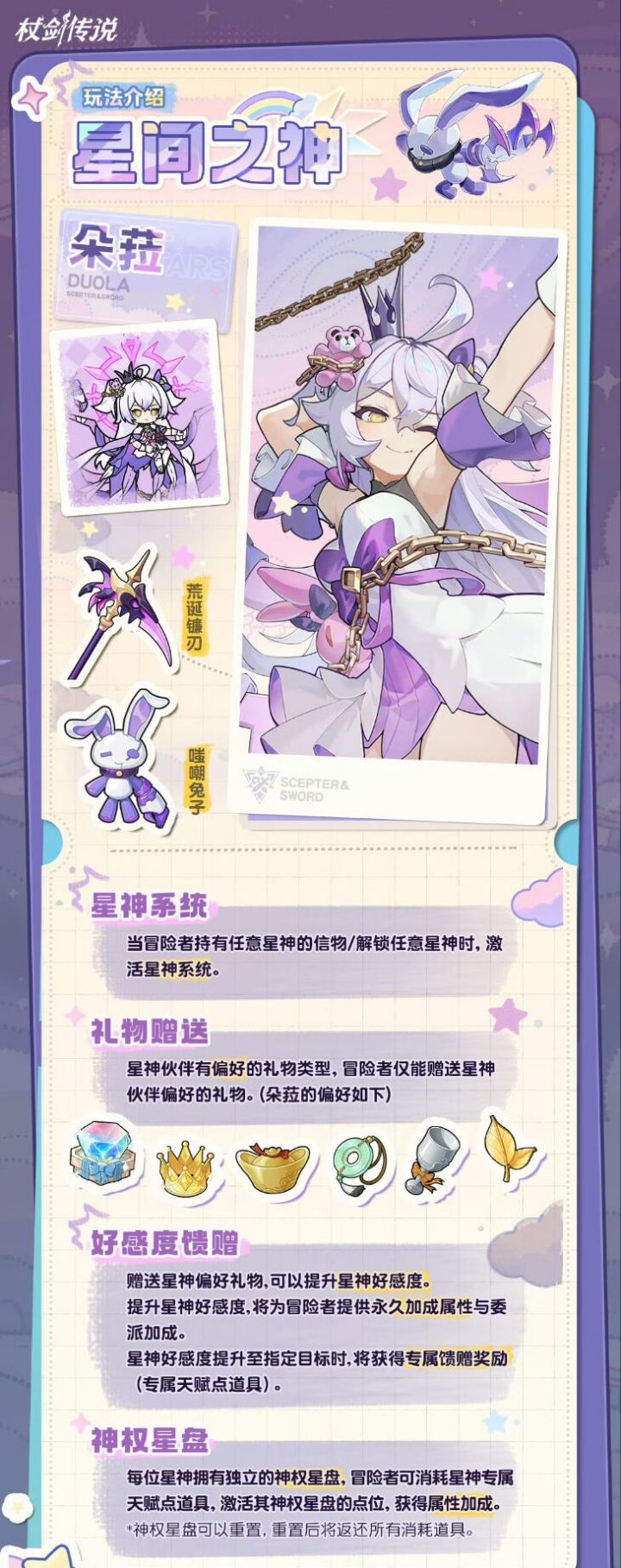 提升星神好感度将为冒险者提供永久属性加成与委派加成,当好感度提升至指定目标时,还可获得专属天赋点道具作为馈赠奖励。每位星神拥有独立的神权星盘,冒险者可消耗专属天赋点道具激活星盘点位获取属性加成,且神权星盘支持重置,重置后将返还所有消耗道具,养成策略更灵活。