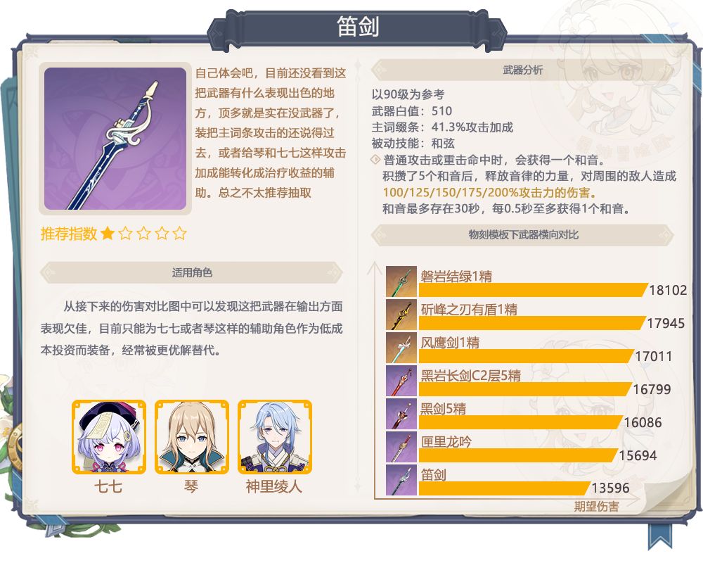 6、笛剑抽取建议:不推荐抽取,常驻武器,使用率基本为0,属于鸡肋陪跑武器
