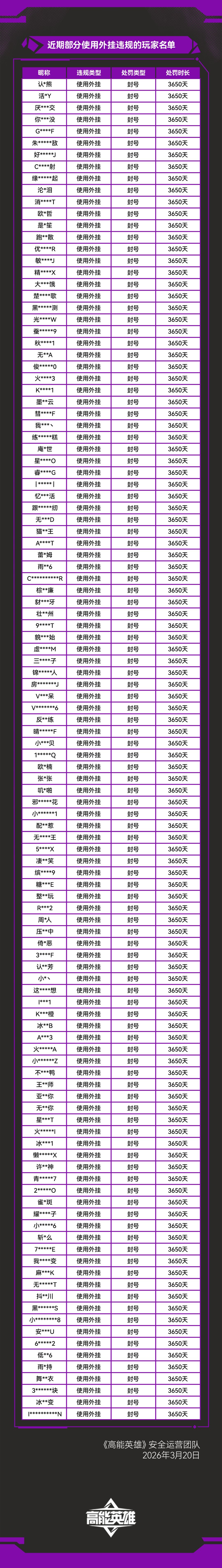 《高能英雄》外挂作弊处罚公告(3月20日)