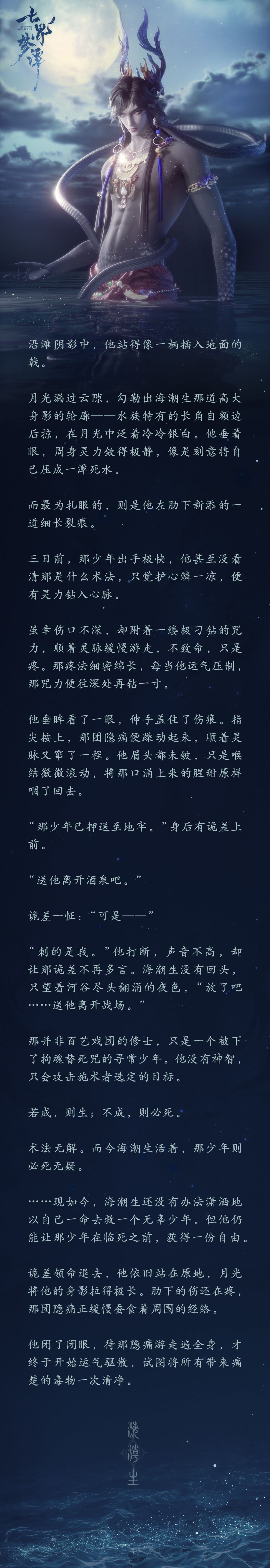 深海的水妖,大多固守安稳,而海潮生的宿命,从不属于无风无浪的海底。他背离族群,投身诡差,主动踏入这纷繁乱世,走的是一条不归、亦无法回头的道路。