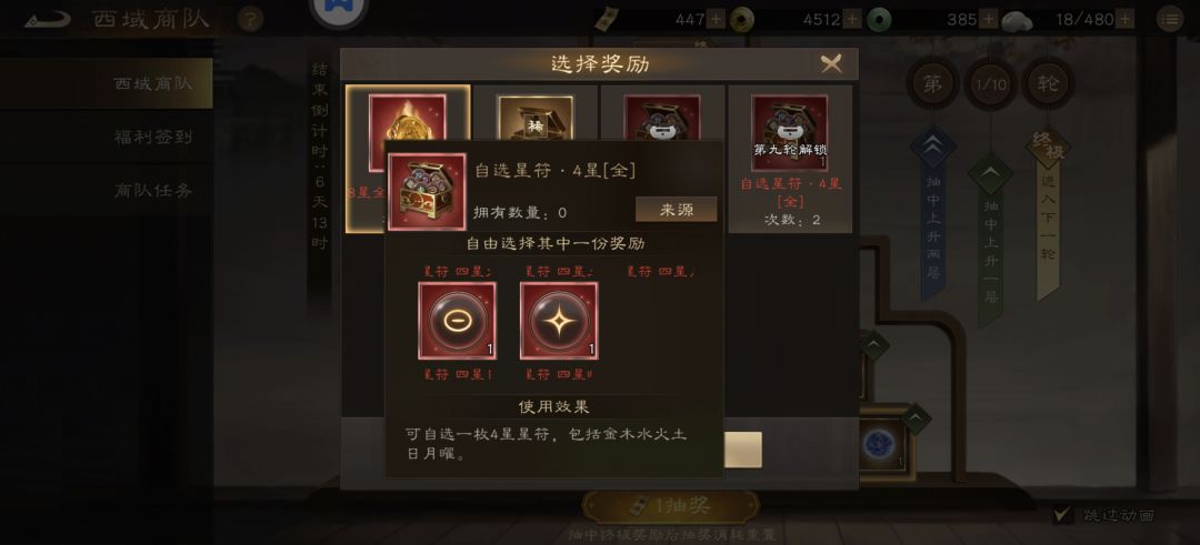 1. 曜星符产出:目前普通玩家只有通过西域商队跑商获取,第九轮和第十轮各一个,合计两个。氪佬可以等终身礼包。唯一的疑问就是转盘以后能否产出曜星符?就目前获取途径来说,很难,后续应该会有更多获取的机会。
