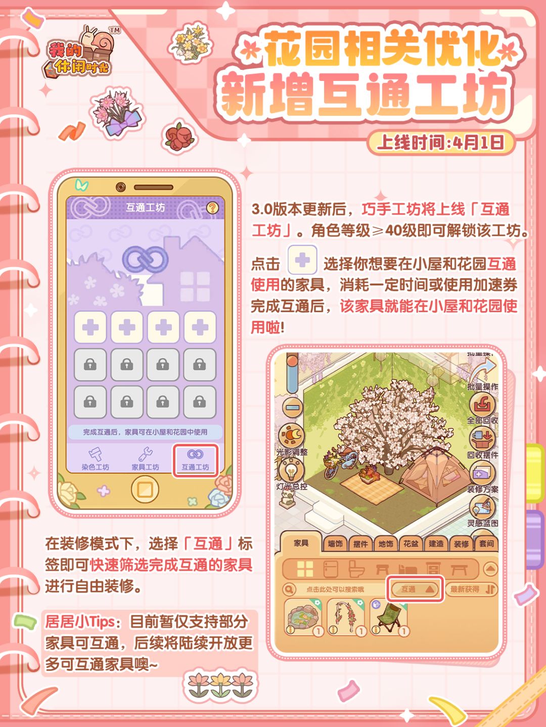 ⭐️全新功能「互通工坊」即将上线巧手工坊!在互通工坊中,选择你想要在小屋和花园互通使用的家具并消耗一定时间或使用加速券完成互通后,该家具就能在小屋和花园中使用啦!更有一批周年庆典特别更新的春季主题限定装饰即将上架园艺铺子,快来一起看看吧~