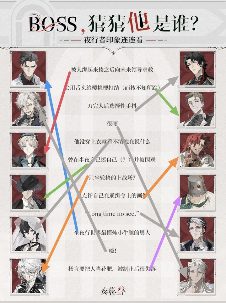 灰色线条的不太确定,因为有的没抽到卡,凭一点点信息联想的(通缉令的画像emmm应该就是海匪了吧,右一第一个角色我真没认出来是谁,我没有他的卡,没穿衣服我只能联想到幽灵那个卡,右边最后一个应该是暴君吧,感觉很硬汉,肌肉应该也是)
