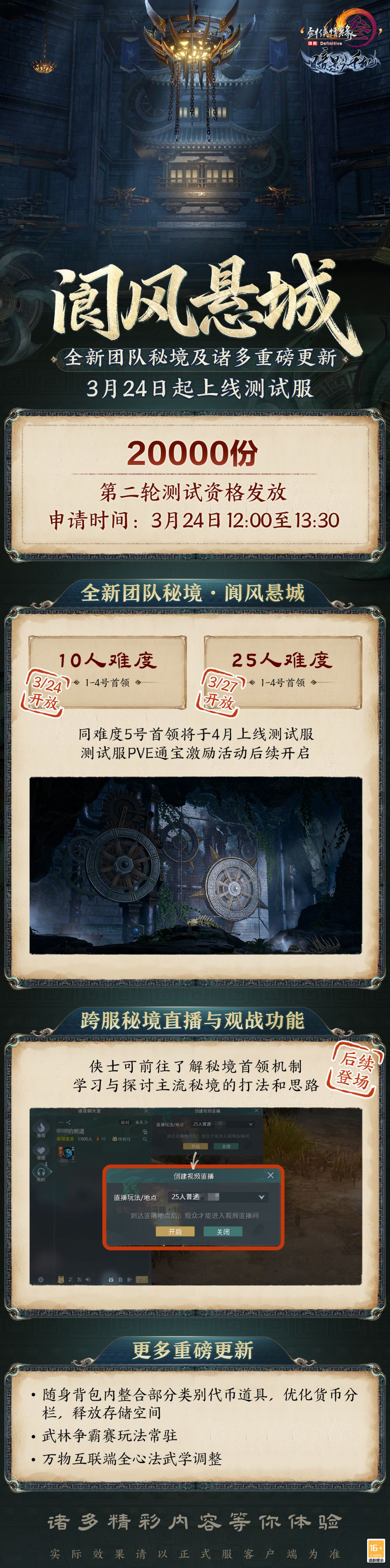 20000份测试资格将于3月24日开放申请,欢迎侠士前往测试服,体验更多精彩内容!每位侠士的反馈和建议,都是推动《剑网3》调优迭代的重要动力!我们将根据大家的宝贵建议进行优化调整,持续打磨更优质的版本内容!