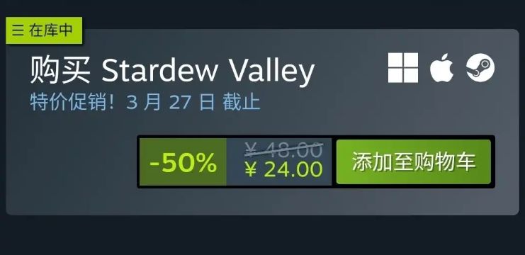 十周年庆典期间并未打折的经典像素种田神作《星露谷物语》,终于在Steam春季促销迎来平史低特惠。游戏原价48元,活动期间仅售24 元,半价入手性价比拉满。