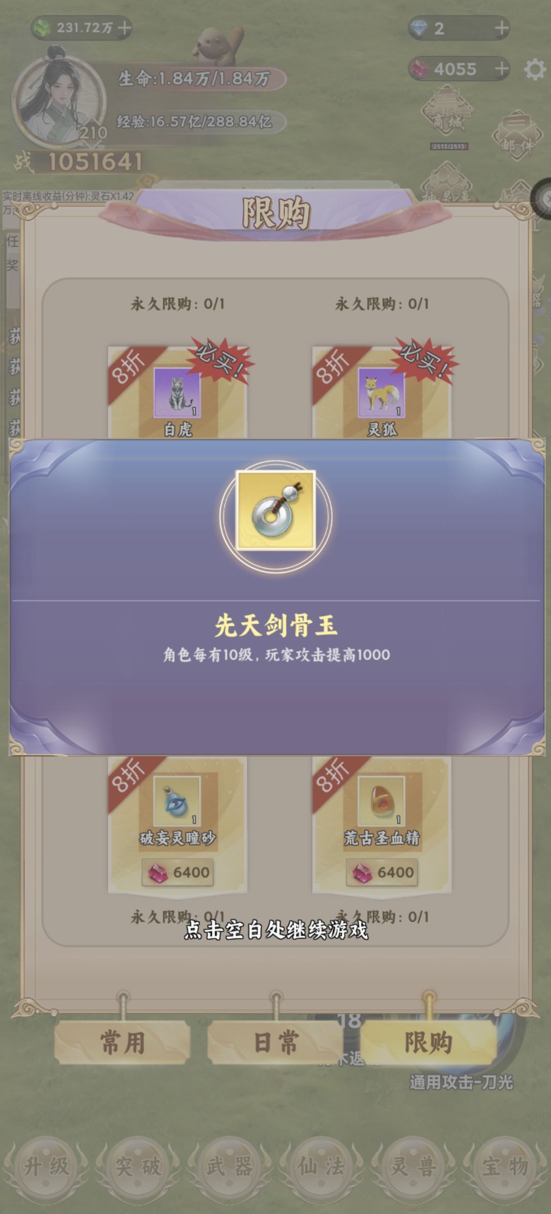 这个游戏节奏就是升级提升境界,按游戏中的任务走到第二章就基本熟悉了。不过要想顺利推图爽玩,首重攻击力,加攻击力的途径是升级加攻击点数,抽武器、制作和强化,升级灵兽附加,装备宝物附加。有了灵兽附加的攻击力,加点攻击不建议,先把暴击率提高到百分百,剩余再加上。抽武器就是挂机灵石区,攒够第三档次的金色宝箱十连的灵石再抽,有没有抽到本章极品金武都可以了,不强求。升级灵兽是既需要灵石又需要灵兽经验,都要挂在资源区漫漫积攒。而最重要的,就是装备宝物了。截图里面先天剑骨玉,角色每10级加1000攻击,简直是前期神器。但需要6400的仙石,所以积攒仙石很重要。前期一毛钱别花,两天可以攒3000多仙石,再做下天道任务,大致2000到手,把宝物买下,后面推图就轻松了。https://l.taptap.cn/LngLfLOe?channel=rep-rep_ncak0ttby1v