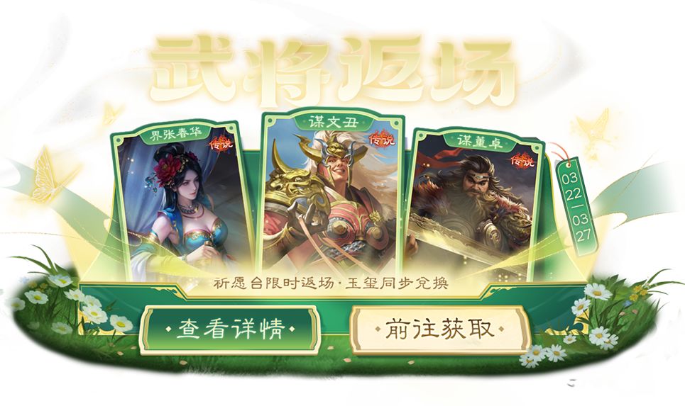 *本期上新 春日龙珠活动(界张春华),返场 踏春龙珠活动(谋文丑)、立春龙珠活动(谋董卓)、清寒龙珠活动(族钟会),龙珠可购买时间:2026-3-22 00:15:00~2026-3-27 24:00:00;