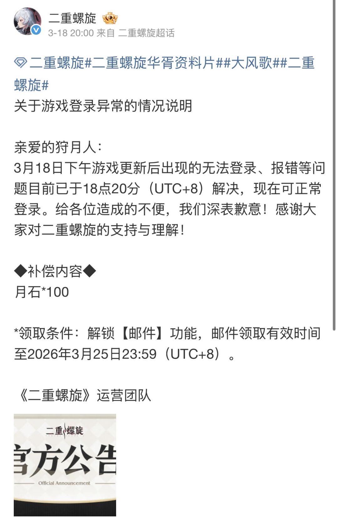 官方已发布详细事故复盘,确认此次事件系项目组办公软件及线上服务器遭海外地区恶意攻击所致。为弥补玩家损失,全服发放月石*100补偿(邮件领取有效期至3月25日23:59),同时表示将升级安全防护措施,新增实时报警监控、严格管控网络访问,杜绝同类事件再次发生。