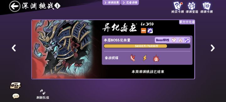 层数62-66层,拉满3深渊可以请假1次,其余需要质量拉满。(冲刺周不能请假,不能来要请机甲)