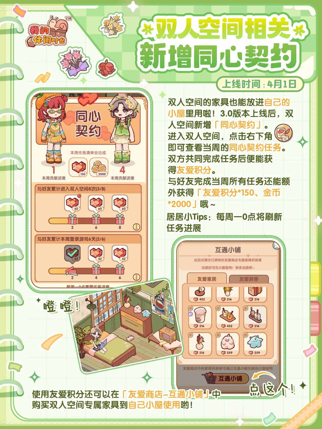 双人空间的家具也能放进自己的小屋里使用啦!在双人空间中,共同完成同心契约的任务即可获得「友爱积分」,使用友爱积分还可以在「友爱商店-互通小铺」中购买双人空间专属家具到自己的小屋中使用。