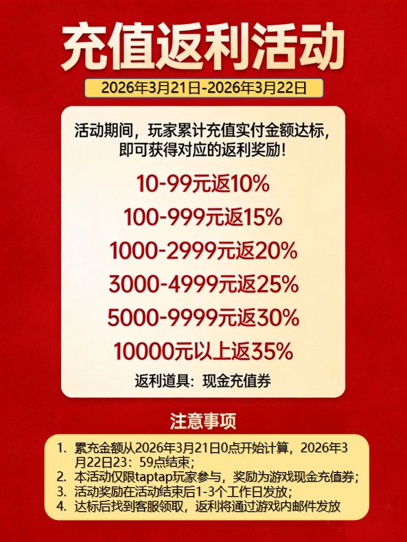 2、本活动仅限taptap的玩家参与,奖励为游戏现金充值券;