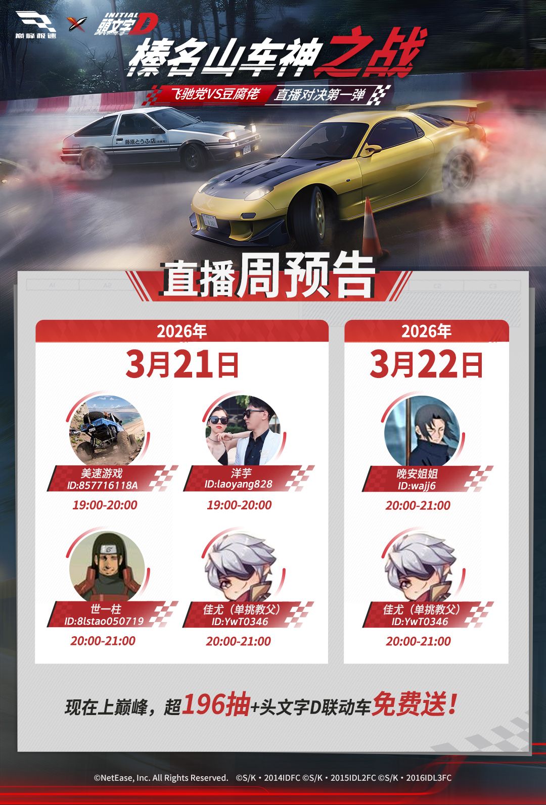 赛制:车辆统一设置为0阶满改,结合26S2新赛季“漂移夜影”主题,使用“头文字D”所有相关车辆,比赛用图为秋名山·五连发卡,每组8人参加,时间最快前2名晋级,决赛再跑一把秋名山,晋级最快的前两名均可获得游戏月卡1张。