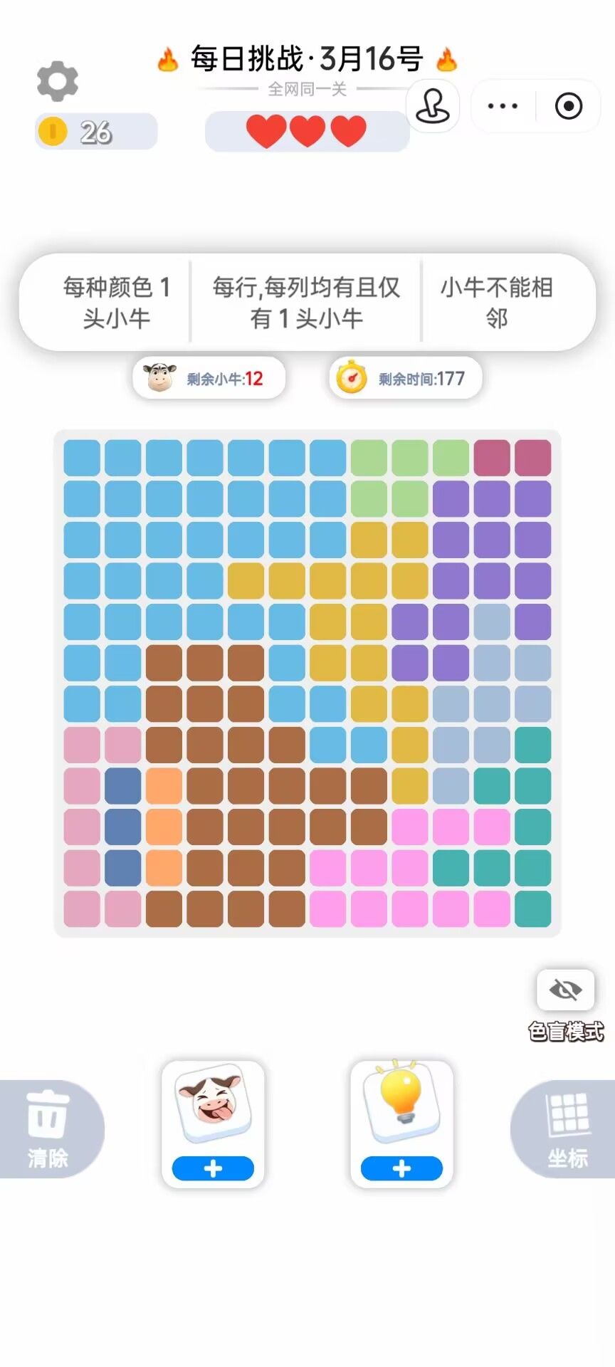 从图上可以看到,这是个12x12个格子矩阵,规则有三条,每种颜色一头牛,每行每列有仅有一头牛,小牛不能相邻。第二条规则确实很像数独,我是自己写过数独的,我第一感觉是能做,好,安排!他们问我预期什么时候做完,我看才周二,那就预计本周吧。