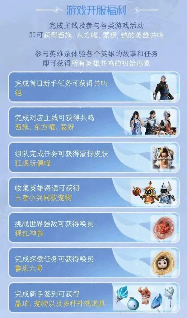 本次开服福利以免费获取、任务即得为核心,降低入坑门槛。玩家完成主线剧情与新手任务,即可免费解锁铠、西施、东方曜、蒙犽等英雄共鸣与初始形象,搭配首发11位英雄(含元流之子、9位王者经典英雄、1位原创角色),快速组建冒险小队。开服期间参与限时活动,可免费领取蒙犽经典皮肤“狂想玩偶喵”,外观全面升级适配开放世界场景;更有峡谷小兵宠物、“红爸爸”宠物、鲁班六号幻灵等萌趣伙伴随行,提升探索乐趣。