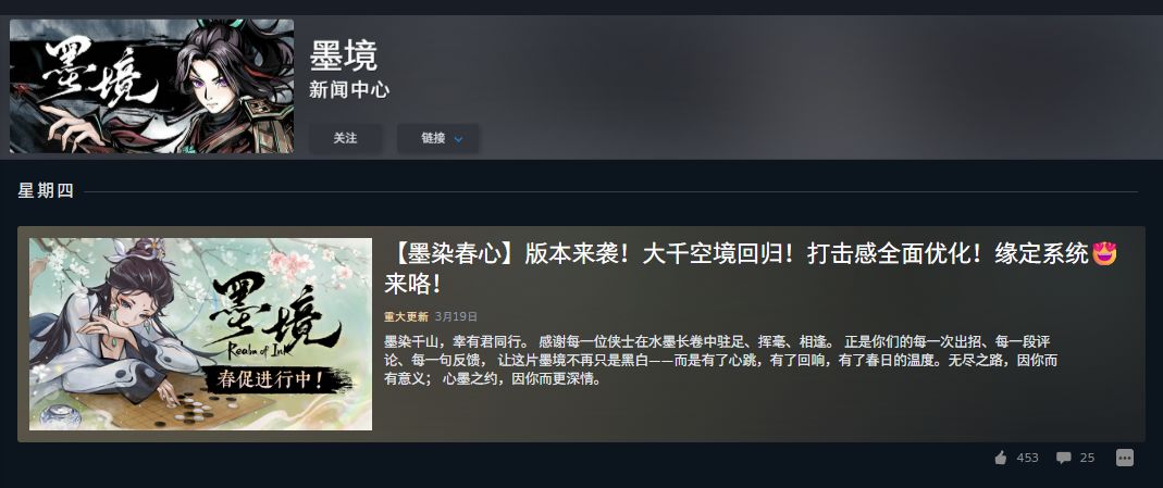 提到国风肉鸽游戏,很难绕开《墨境》这个游戏,水墨画风与爽快战斗形成鲜明特涩。此次春季特卖期间,本作迎来墨染春心版本更新,并同步开启-10%折扣,目前49.50元即可入手,活动结束后将上线1.0正式版并上调价格。