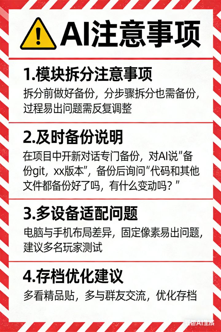 2.一定要及时备份。在当前项目重新开一个对话,专门用于备份。跟AI说:“备份git,xx版本”。备份好了一定要询问AI:“代码和其他文件都备份好了吗,有什么变动吗?”,如果不问的话,AI可能会误解你的意思,导致只备份了一个标签名称,没有备份完整的代码文件,到时候想恢复却发现根本没备份过。