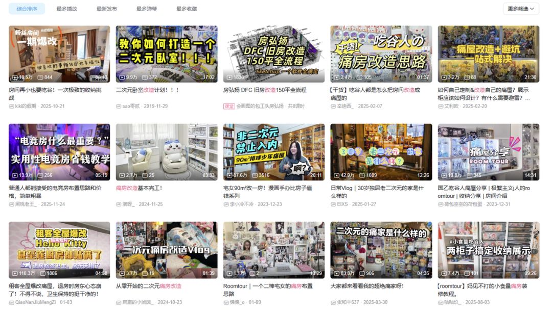 从2023年到2026年,随着年轻Z世代用户的兴起,B站出现了大量“痛房装修”视频,他们把出租屋或自己的小房间,贴满喜欢的动漫海报,摆满好看的手办和周边,打造出一个完全属于自己的“精神角落”。