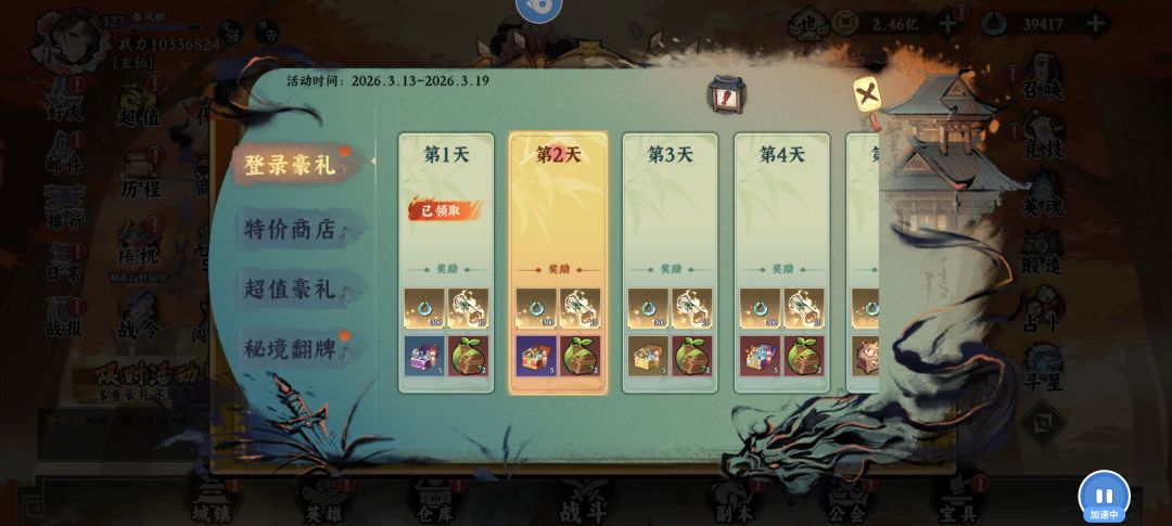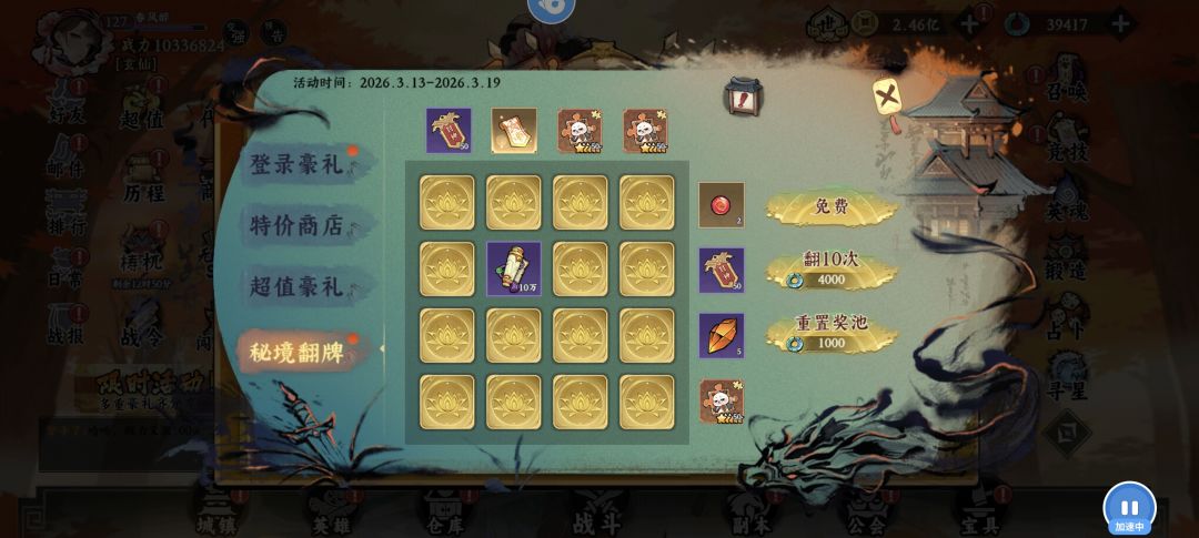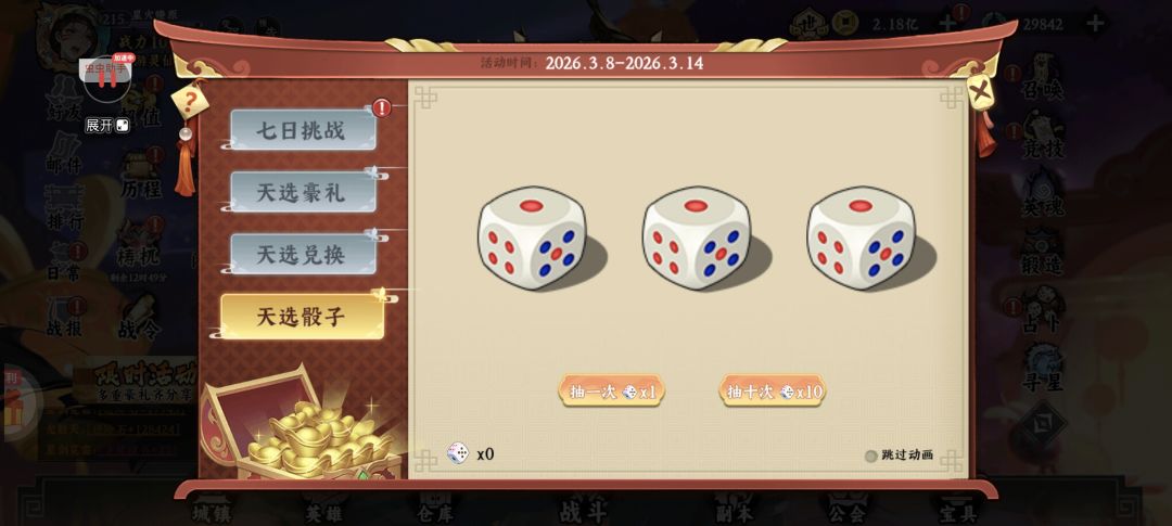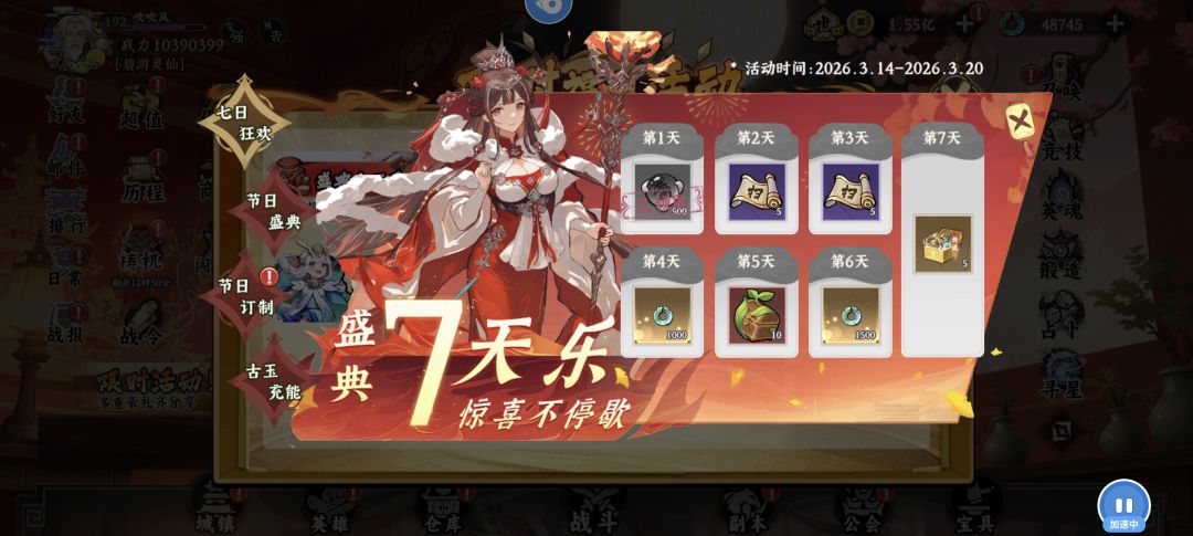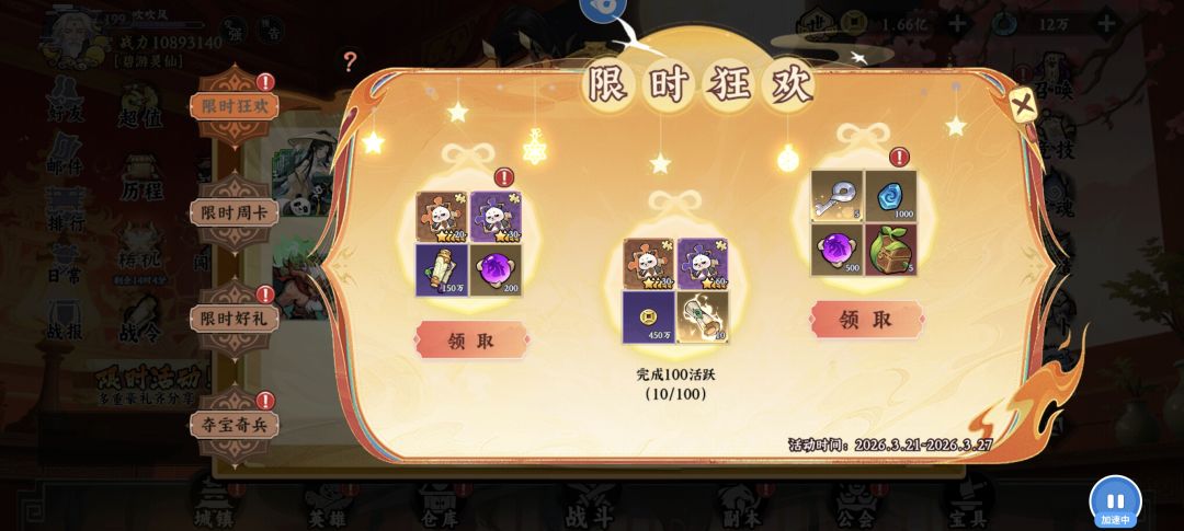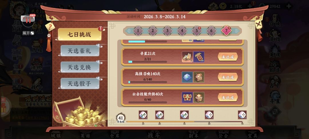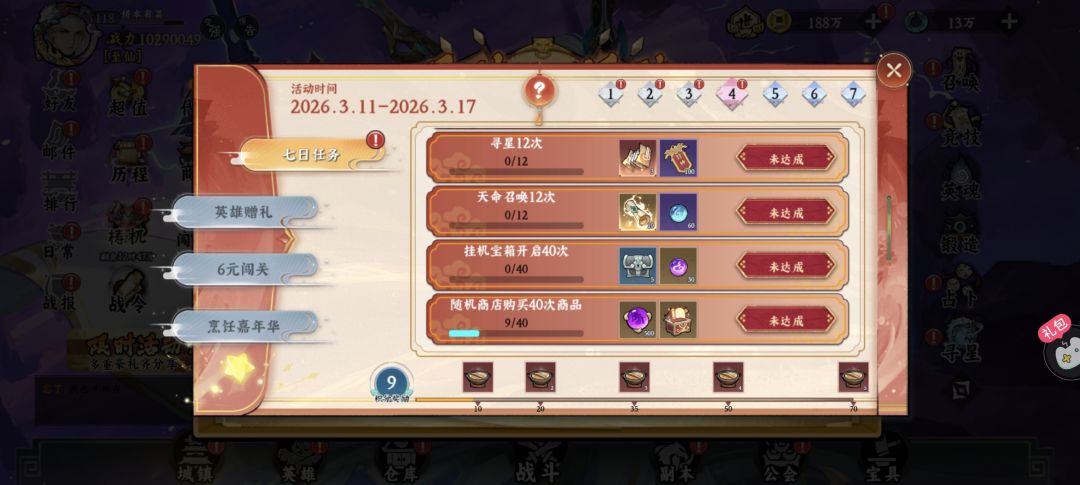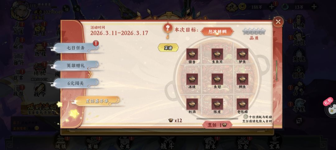 烹饪嘉年华→天选盛宴(天选骰子)→盛典七天乐(古玉充能)→限时活动(夺宝奇兵)→限时活动(秘境翻牌)→英雄远征