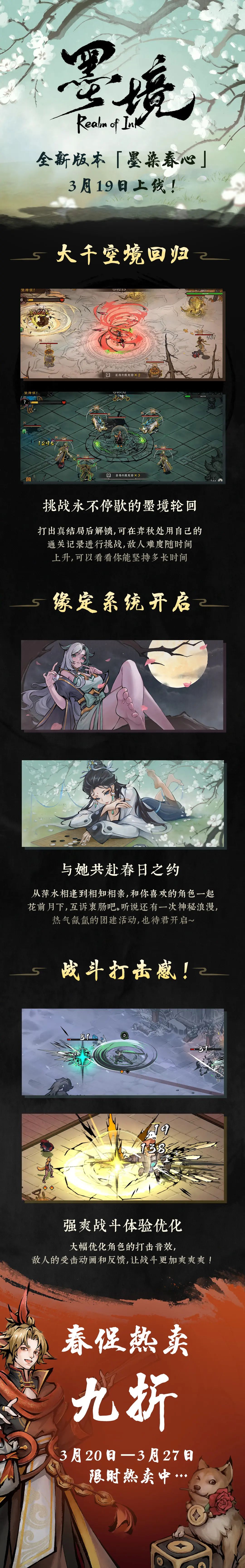 为了迎合转正式版,官方大大也诚意满满,不仅在春促期间限时打9折特卖,而且上线了春季版本「墨染春心」,大千空境回归!打击感全面优化!缘定系统上线!
