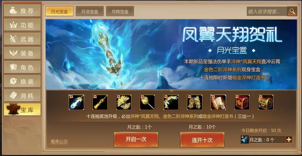 月之匙*10可以在月光宝盒来一次痛快的十连抽,有机会获得淬神系列武器,鬼马*七星罩,怒火*天狮等顶级装备。
