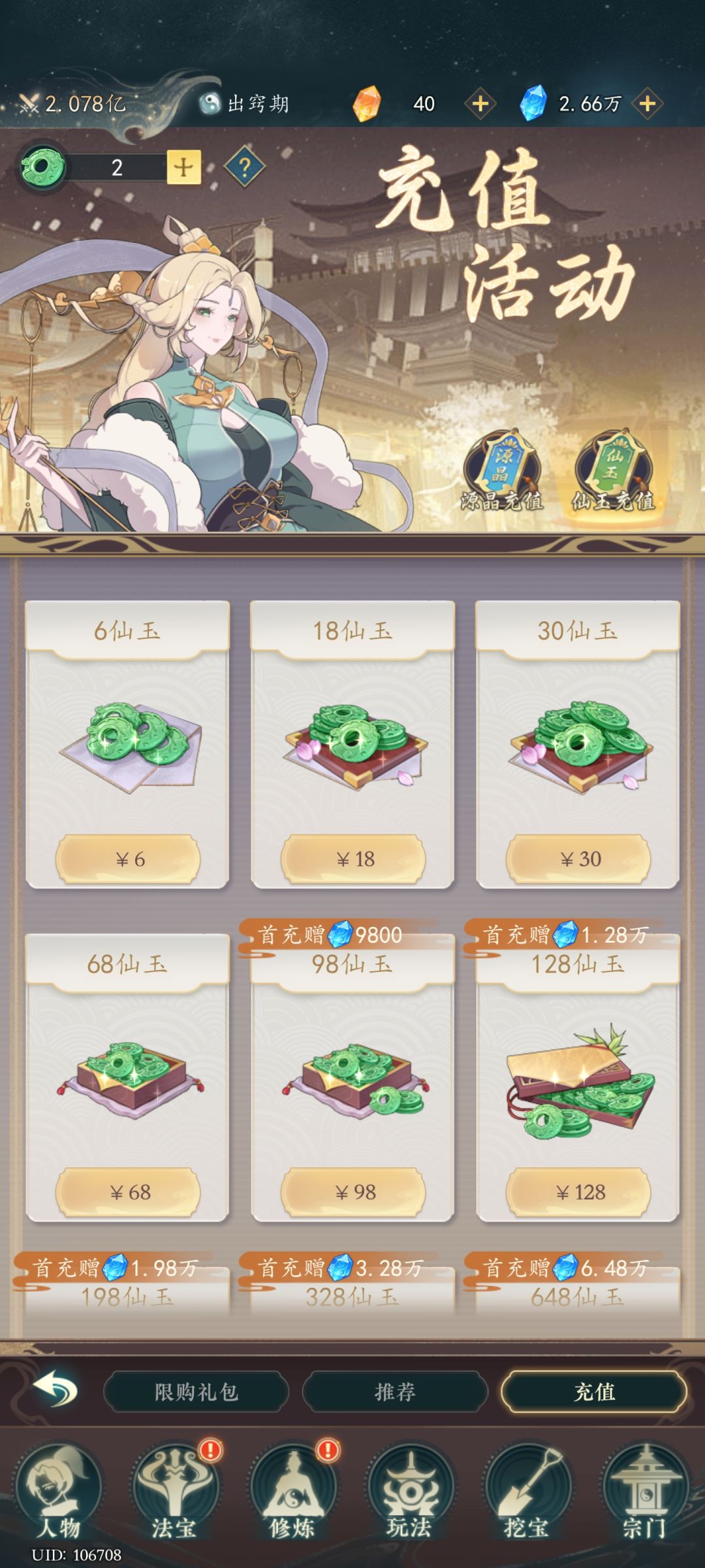 2.说到氪金,咱们氪金如何开局呢?想必大家已经被各种充值入口迷了眼,主包这边推荐的话还是两张卡,都可以领到零食,洞天时间。基金的话这边推荐灵池还有境界,因为一个解决了日常花销,另一个解决了修为。剩下的看经济实力补,还有两个战令,也是看你的情况,还有首充礼包,两个档位也可以都拿下。前期一大助力爬塔的话也是很好用。重氪除外,因为如果你要氪很多的话,5000多就可以玩的很舒服了,但我们要充最划算的。按照主包这样开局,第一第二不敢说,第三,绝对是稳的。除非对面比你多氪几千,实力碾压,这时候就有人问了,充多少才划算?我这边推荐是拿完卡,再把首充礼包拿了之后,剩下的就可以不用充了。可以先充仙玉,等下一波活动再去用仙玉买那些礼包。因为很多活动都是可以领很多东西,充多少领多少。所以说微氪又不想投入太多,而且还想玩的很舒服,可以按主播这一套来。基本上1000以内就能玩的很舒服了,剩下的一些七七八八的礼包,想补就补,不补就算了。因为如果你要冲战力的话,1000不止,因为也有很多人要冲。如果只想收收菜的话,还可以去买一个菜园子的卡,为什么会这么说?因为他那个菜园子的菜可以合成丹药,而我们平民或者是微氪的话,丹药来源很少,除了基金,基本上就是副本。而菜园子恰恰又解决了这一点,只要偶尔上个线,收一下菜,基本上一天的丹药是够用的。剩下的一些挖宝卡,都是看经济情况补。还有最重要的一点,先冲仙玉,再去买,会多一大笔零食,先冲仙玉,先冲仙玉,先冲仙玉,主要是说三遍。#游戏日常 #游戏杂谈 #浅评一下 #游戏攻略 #幻世仙途兑换码 #幻世仙途 #幻世仙途攻略