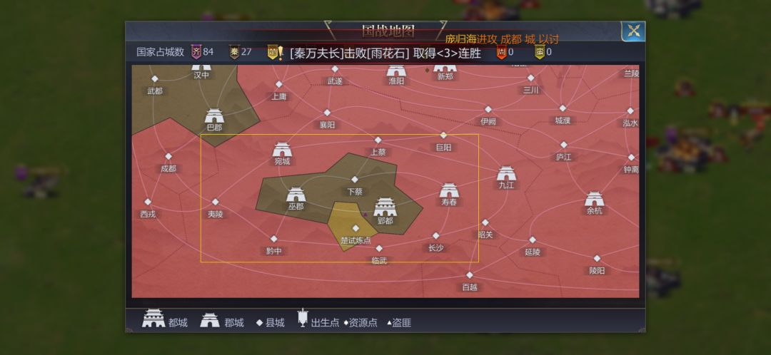 初,齐秦对峙,齐军戍守东北宛城、武遂、淮阳、新郑至西南一线,绵延千里,壁垒森严。倏然,齐将【以讨伐天下】率锐师突袭秦地襄阳,秦将【庞归海】闻变,急调兵卒驰援,两军交刃,烽烟骤起。齐军弃守为攻,挥师西进,掠秦疆土。秦军奋力拒之,然齐军势猛,终不能敌,宛城遂陷。秦地被截,巫郡、上蔡、下蔡孤悬一隅,秦军困守其中,进退维谷。