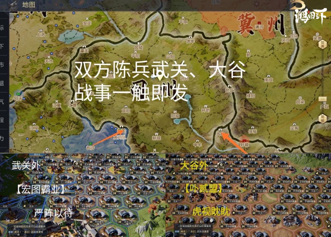 10月25日,以【雅诗兰黛】为首的凉并势力,和以【鸿途天下】为首的益并势力整合,形成约300人左右新盟【宏图霸业】。扬州【卟贰盟】则整合了幽、青、徐、扬四州势力,同样约300人,双方分别陈兵武关、大谷,意欲破关入司州,进行最后决战。