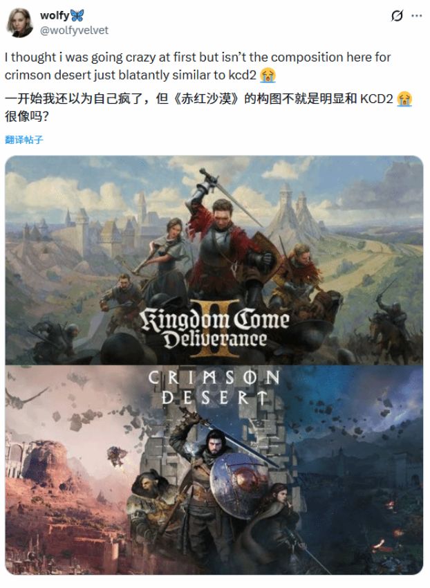 近日,海外社交平台用户wolfy发布游戏封面对比图,指出Pearl Abyss旗下《红色沙漠》封面构图与《天国拯救2》高度雷同,相关话题迅速引发热议。