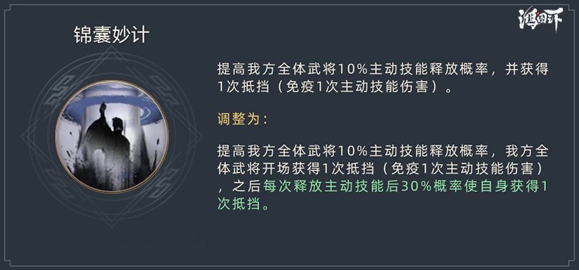 小图点评:优化前除释放概率以外仅有1次抵挡机会,这个技能效果相比于诸葛亮高达9的将令值确实显得太过薄弱。更新之后的诸葛亮在原有效果基础上增加了后续队伍的承伤能力,每次释放主动技能都有30%的几率获得【抵挡】,对比优化前提高了技能的保护效果和持续效果。