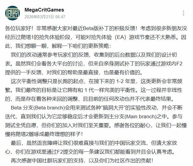 今天,《杀戮尖塔2》开发商MegaCritGames发布公告,针对Beta版补丁反响不佳的玩家反馈,阐释抢先体验阶段更新逻辑,同时正式回应中国玩家的相关关切。