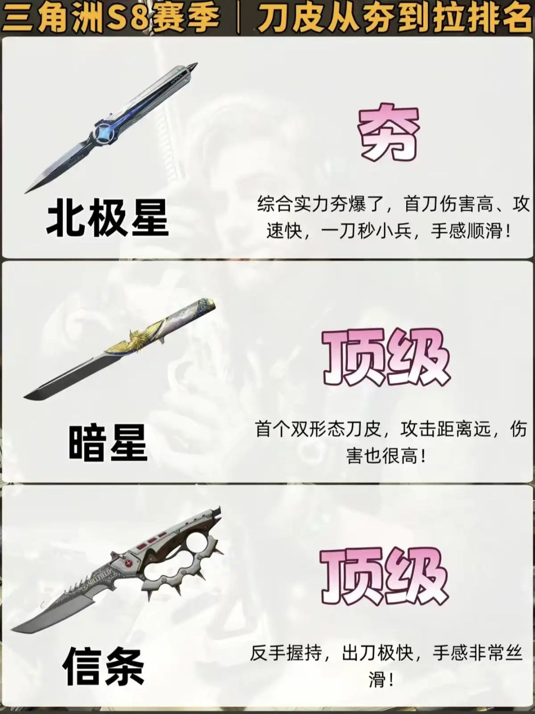 T0北极星首刀伤害拉满,攻速快到能一刀秒小兵,挥砍手感丝滑到离谱,实战里就是“出刀即收割”的代名词,综合实力直接拉满天花板! T0.5暗星游戏首个双形态刀皮,攻击距离远得离谱,伤害也稳在高位,切换形态的瞬间既有颜值又有压制力,颜值党和强度党双厨狂喜!信条反手握持的独特设计,出刀速度快到几乎看不见前摇,手感丝滑到让你怀疑人生,贴脸博弈时总能快人一步先出刀!黑海“一刀秒小兵”的开创者,攻击范围广、爆头倍率高,挥砍时的压迫感拉满,不管是清杂还是对人都能打出爆炸效果! T1怜悯老版本真神级存在,两段收刀动作优雅到犯规,颜值直接封神,即便版本更迭,依旧是不少老玩家的情怀与手感双优选! T2赤枭老赛同款爪刀造型,刀柄鳞纹像猛禽利爪,手感扎实厚重,伤害输出稳定,属于“下限极高、上限看操作”的实用派刀皮!影锋转刀检视动作丝滑帅气,伤害中规中矩,颜值和观赏性拉满,适合喜欢耍帅、追求视觉效果的玩家!龙牙龙鳞纹路华丽吸睛,外观辨识度拉满,但伤害稍显不足,多数特殊兵种需要两刀才能解决,更偏向收藏向选择! T3 电锯惊魂时间会证明它就是一坨!笨重的挥砍动作、拉胯的实战表现,除了整活搞怪,几乎找不到任何上场的理由,纯纯的娱乐向“废稿”刀皮!版本在变,手感不变!不管是天花板的北极星,还是整活的电锯,顺手的刀才是你的本命武器!S8赛季用对刀,每一次出刀都能收割全场!你最爱的刀皮是哪一把?评论区告诉我!#pc游戏攻略评测 #游戏日常