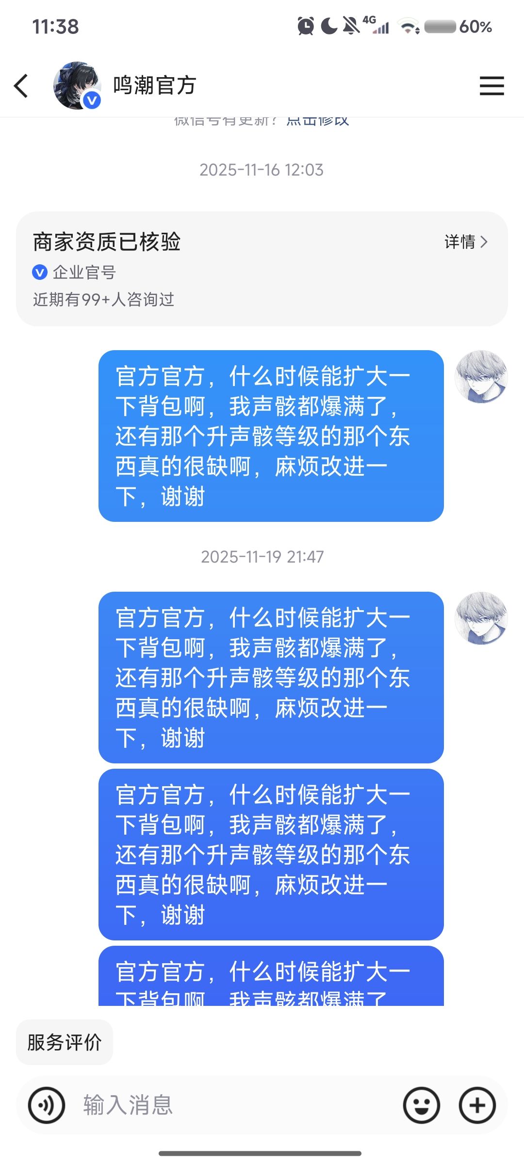 库洛有个严重的问题,那个就是服务不行,怎么说呢,库洛嘴上说着听玩家的建议,看着很民主,实则一坨大便,我从去年背包就已经爆了(好像是2.7左右吧,我也忘了),所以我融了一堆声骸,我那时天真的以为库洛会知道过了这么多个版本玩家的声骸背包是不够的,我就一等再等,结果呢,现在都快3.3了,屎都没有一点,光顾着出角色了?还是说光顾着圈钱了,你出了这么多声骸管理,前提是你背包要够大啊,不然你管理个🥚啊,我才玩了400来天(开服玩家,中间退游几个月)背包就炸了,那那些一直没退过游的玩家呢,我们要怎么办,你一直出角色,角色声骸练度不好怎么玩,你的怪现在还这么多护盾,你要那些练度低的玩家怎么办,让那些背包满的人怎么刷,大家不要反驳我,我是已经忍无可忍了,3000的声骸背包,我起码溢出2000,我每天都刷满那些声骸,每天都有30个声骸左右(刷新不刷旧),我是融了又融,库洛你呢,连客服都是傻傻的,光会个复制粘贴了,口口声声和我说帮我反馈反馈,你们真的有反馈吗,我已经被气消了,每天都在催客服,那种对牛弹琴的感觉我真的想一拳打进屏幕,说真的,库洛你要是这样下去,别说赚钱了,玩家都一个一个变少,我已经有种要退游的感觉