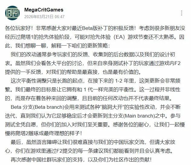 公告中,开发团队首先感谢玩家对测试补丁的密集反馈,并针对本次争议作出解释:本次Beta分支的平衡调整,仅是未来1—2年长期打磨过程中的首次实验性改动,并非最终定型方案。团队强调,抢先体验的平衡迭代并非线性过程,后续会依据数据与反馈频繁回调,当前数值与机制不代表游戏正式版品质。