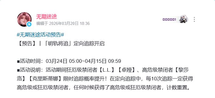 官方于3月20日发布明轨将追定向追踪预告,宣布复刻LL和卓娅,然而公告中的配图,却将LL的职业图标标错。 在经过玩家提醒后,官方目前已将错误问题修复