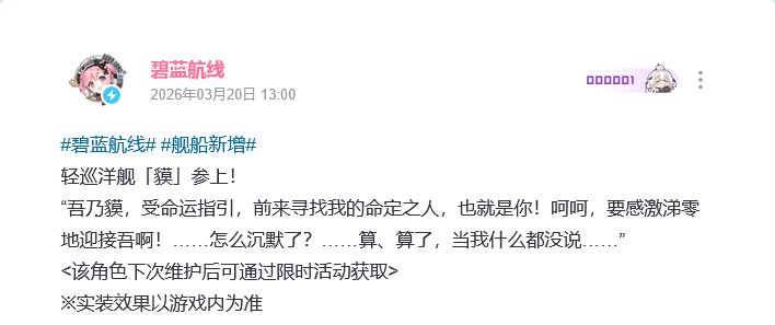 新船分别是轻巡洋舰和航空母舰,名字分别为貘、靇,确认将在下次维护后实装,立绘见图