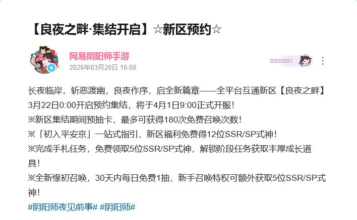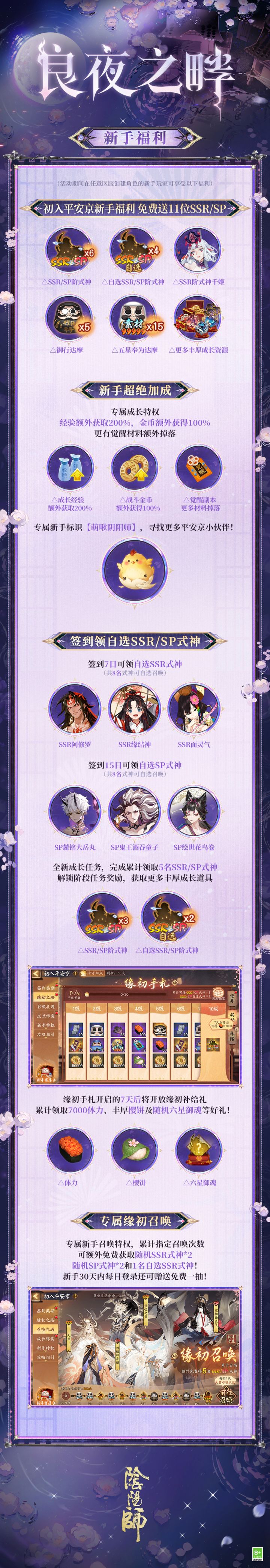 据爆料,本次新区较为照顾新入坑玩家,初入游戏免费可得12位SSR/SP式神,完成任务再领5位,新手缘初召唤30天内每日免费1抽,额外获取5位SSR/SP式神