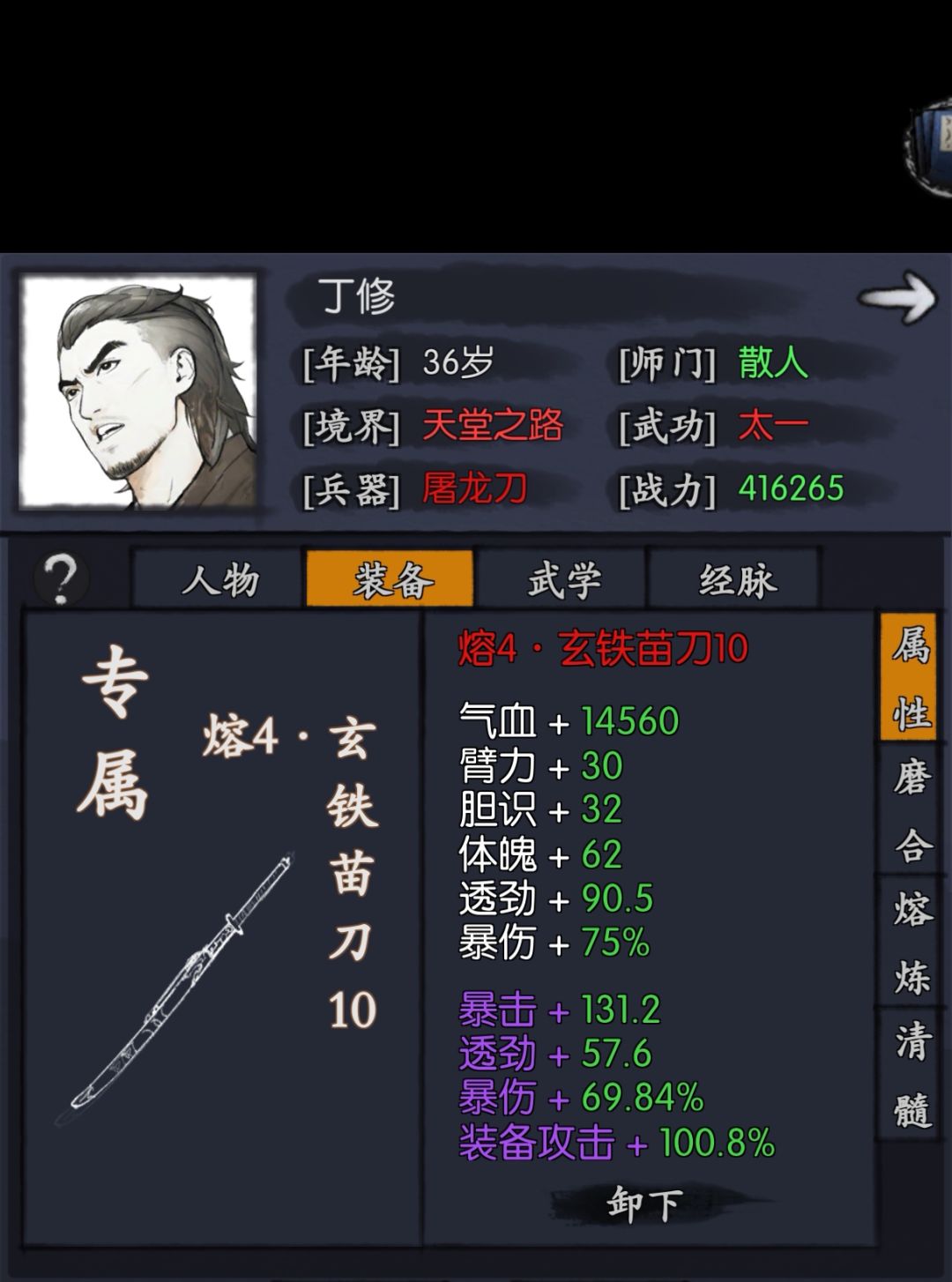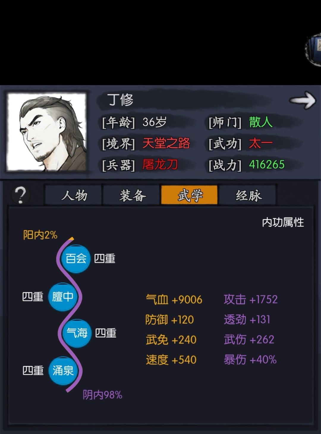 1.属性方面,大C要求的就是C的能力,核心就爆伤暴击透,然后就是攻击和命中,这个侠客做大C就不考虑双防了,要血量保命了。说一下第一梯队的核心达标数据吧,爆伤800以上,此项笔者未达标;暴击2300以上;透900以上;攻击和命中越高越好,血量越厚越好。要点速度的,选黑蚁是本人喜欢输出,具体选啥其实更看重洗练,这游戏洗练>装备选择。