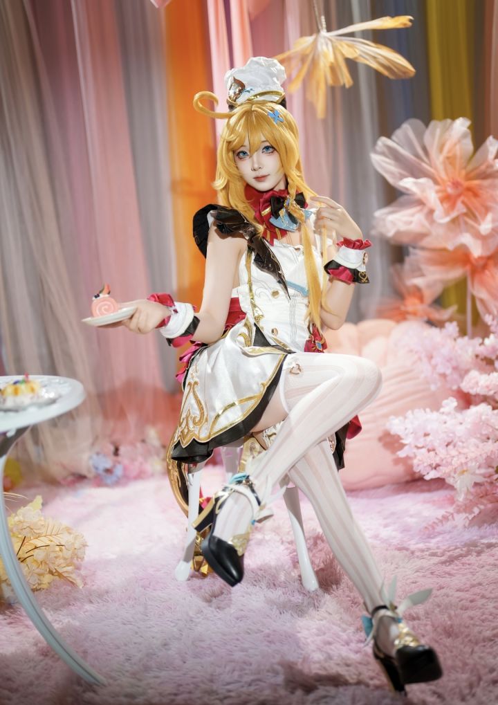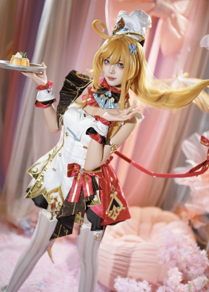 暖粉纱幔轻垂,将整幅画面晕染成甜腻的奶油色调,爱可菲的coser宛如从纳塔烘焙坊走出的甜点精灵,每一处细节都在诉说着温柔与治愈。蓬松的金发如融化的蜂蜜,在光线下泛着暖融融的光泽,额前俏皮的卷翘呆毛与发间的蓝色蝴蝶发饰相映成趣,精准还原了角色灵动甜美的神态。澄澈的蓝眸像浸在冰饮里的蓝莓,眼尾微微上挑,带着几分娇憨与狡黠,仿佛下一秒就要笑着递上刚出炉的焦糖布丁。服饰还原堪称极致,白红金三色交织的女仆装层次分明,黑金撞色的肩甲缀着细腻纹路,胸前的蝴蝶结与颈间的蓝调配饰精致得恰到好处,白丝上的金线刺绣与腰间的酒红飘带,将法式优雅与少女娇俏完美融合。她一手托着盛有甜点的银盘,一手轻抬于胸前,姿态优雅又带着邀宠的娇憨,连指尖都透着甜意,仿佛连空气里都飘着香草与黄油的香气,让人忍不住想接过那盘甜点,沉溺在这份温柔甜美的梦境里。